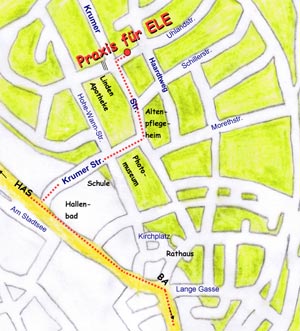 Folgen Sie der Bamberger Str. bis durchs obere Tor, biegen Sie dann rechts ab (dem Wegweiser Schule/Hallenbad folgend). Sie befinden sich nun bereits in der Krumer Straße. Wenn Sie auf der linken Seite die Lindenapotheke sehen, biegen Sie rechts in die Stichstraße ein. Sie befinden sich dann genau vor der Praxis.
